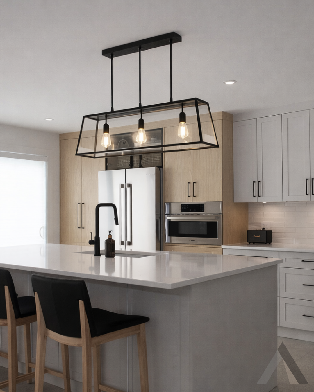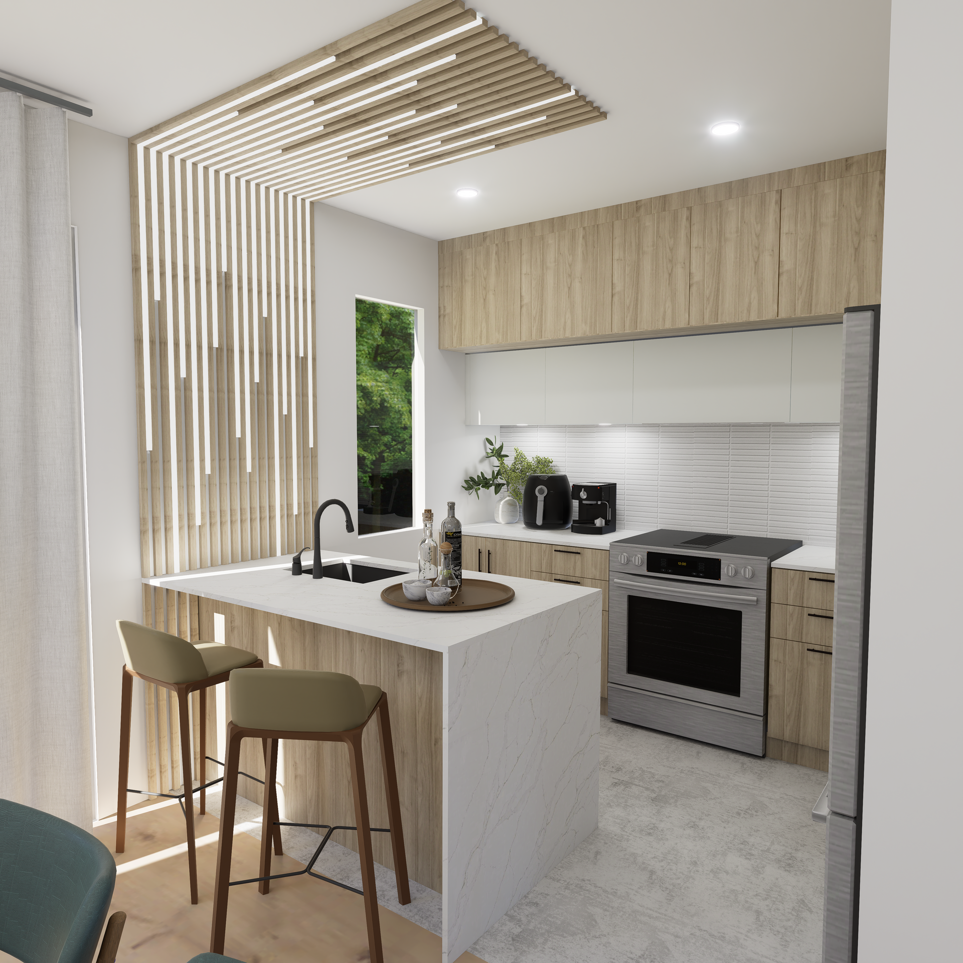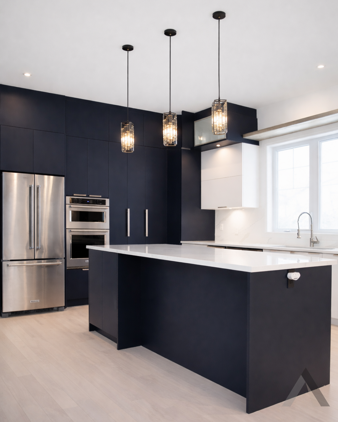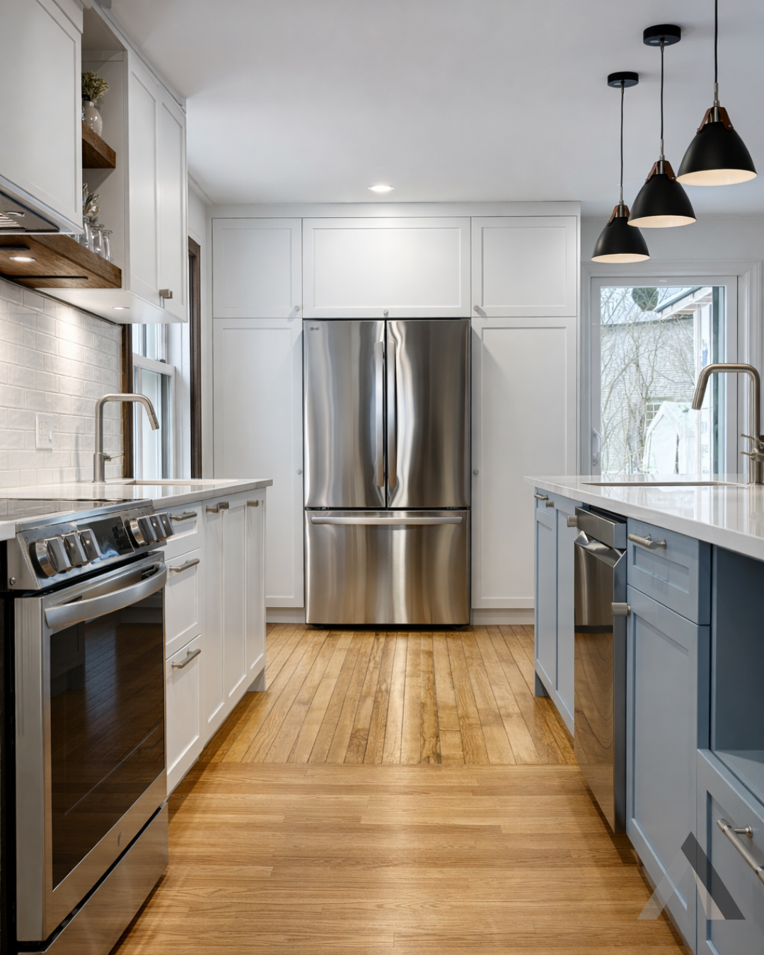 Une cuisine avec électroménagers en acier inoxydable et un grand îlot au milieu.