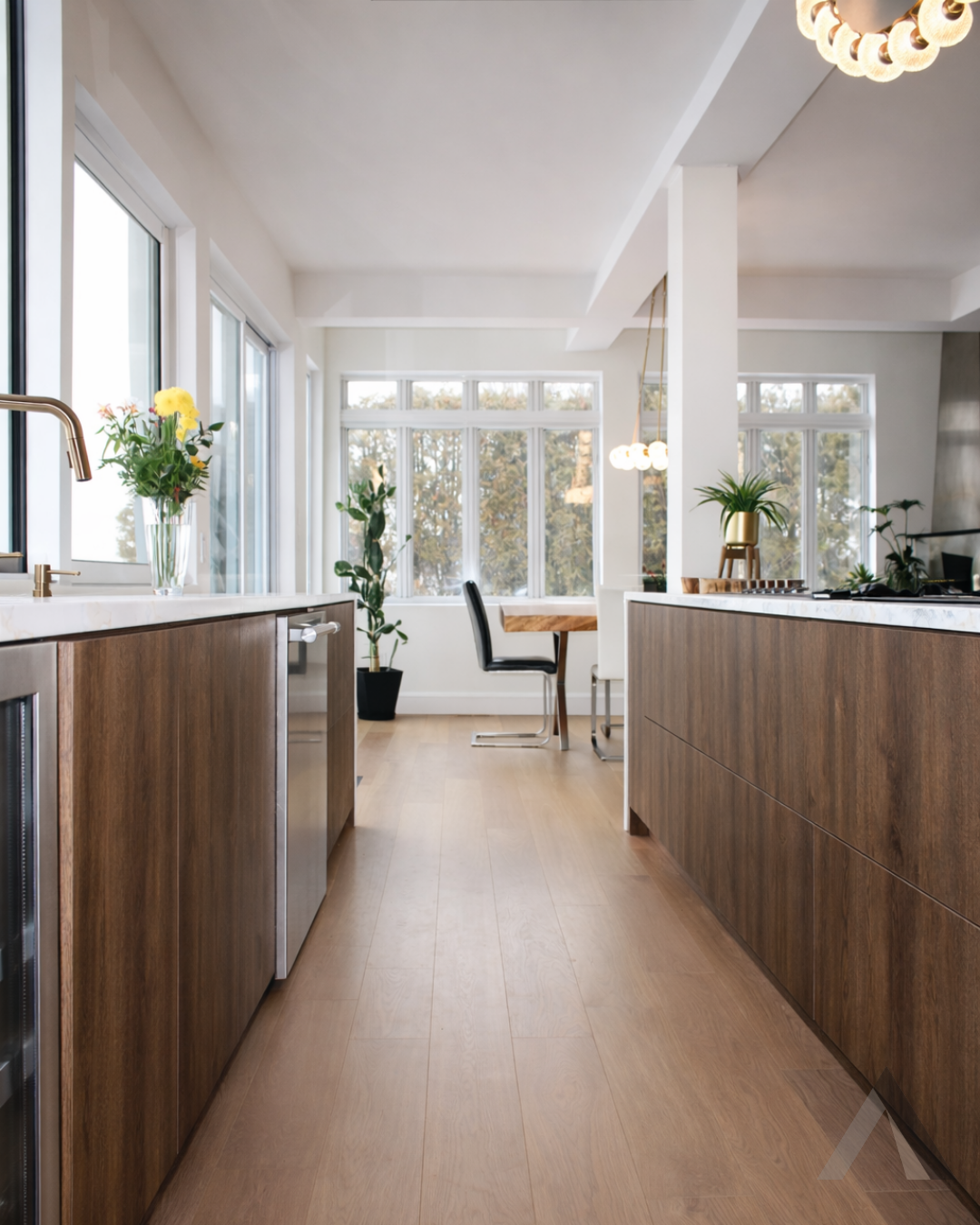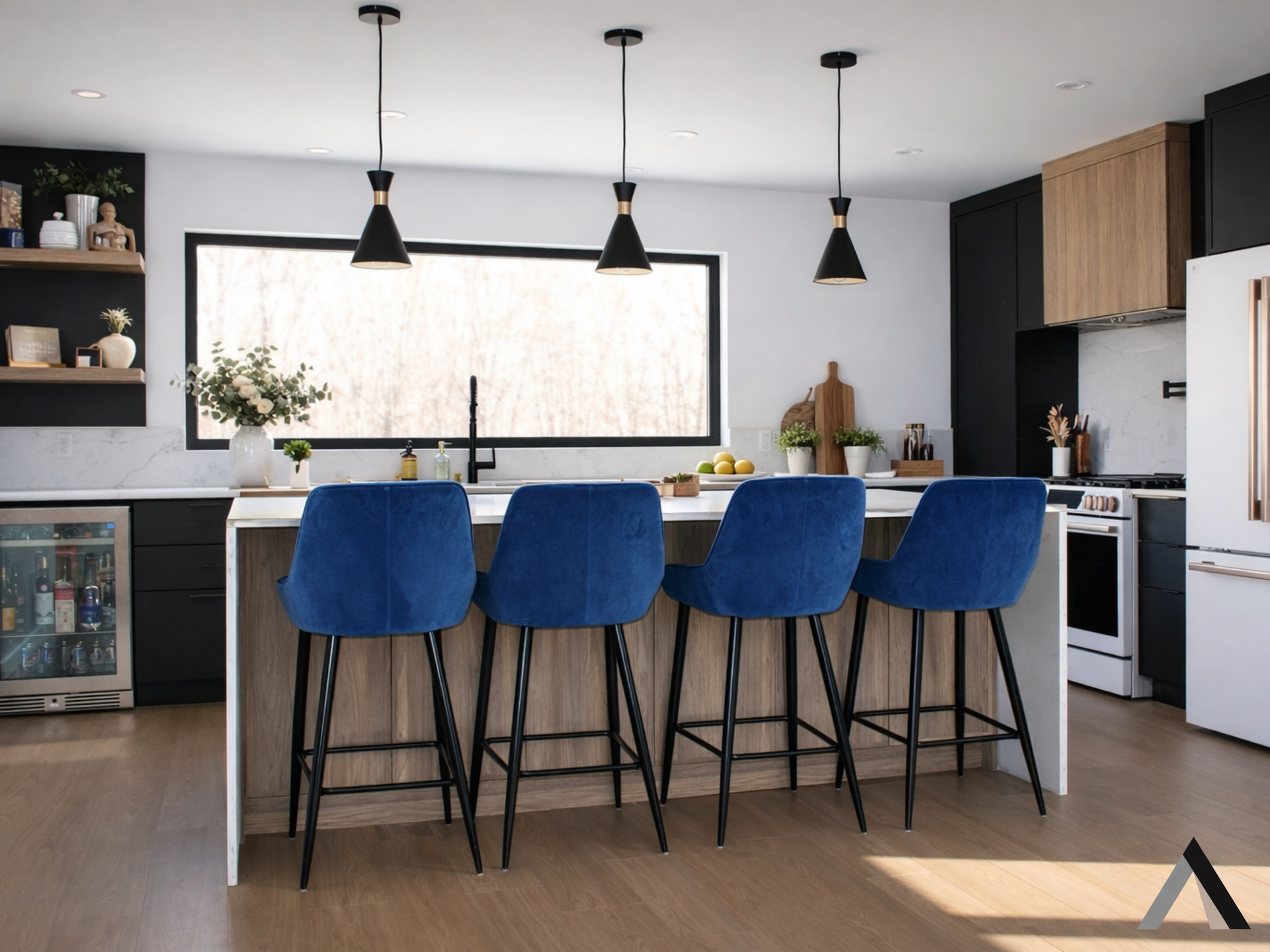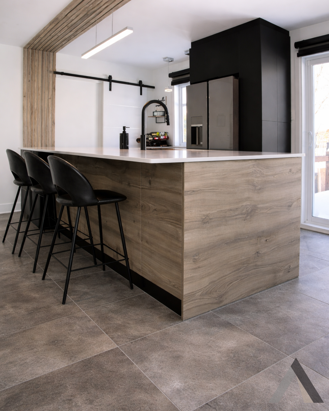Une cuisine avec électroménagers en acier inoxydable et un grand îlot au milieu.