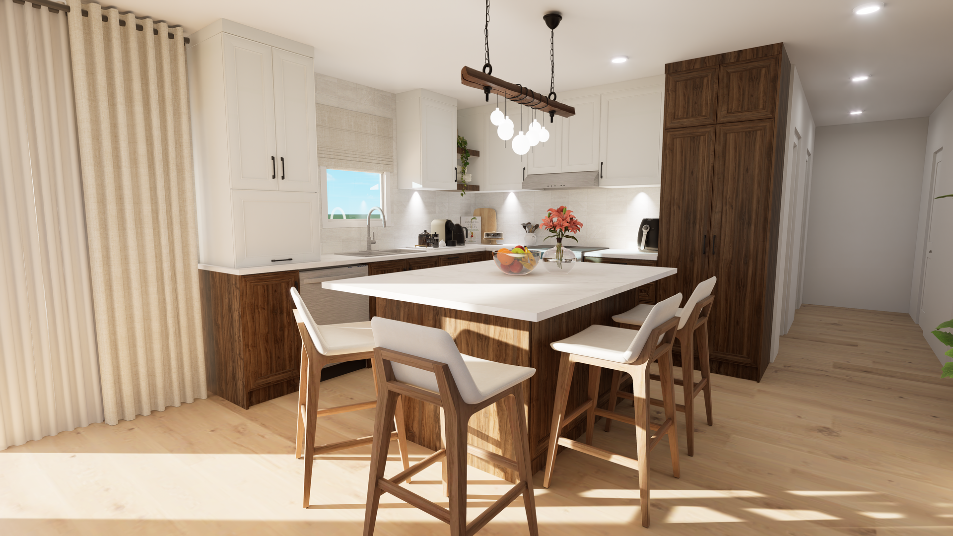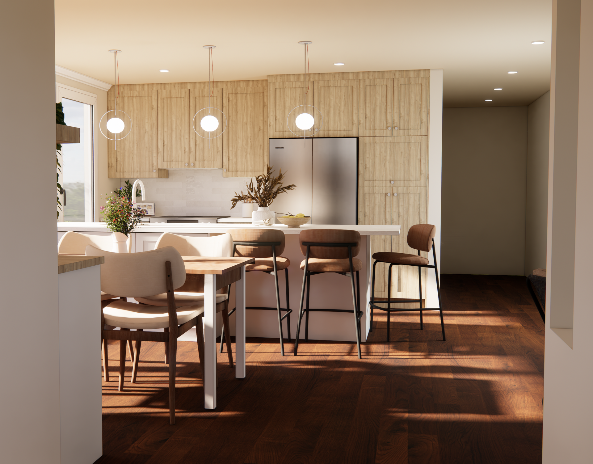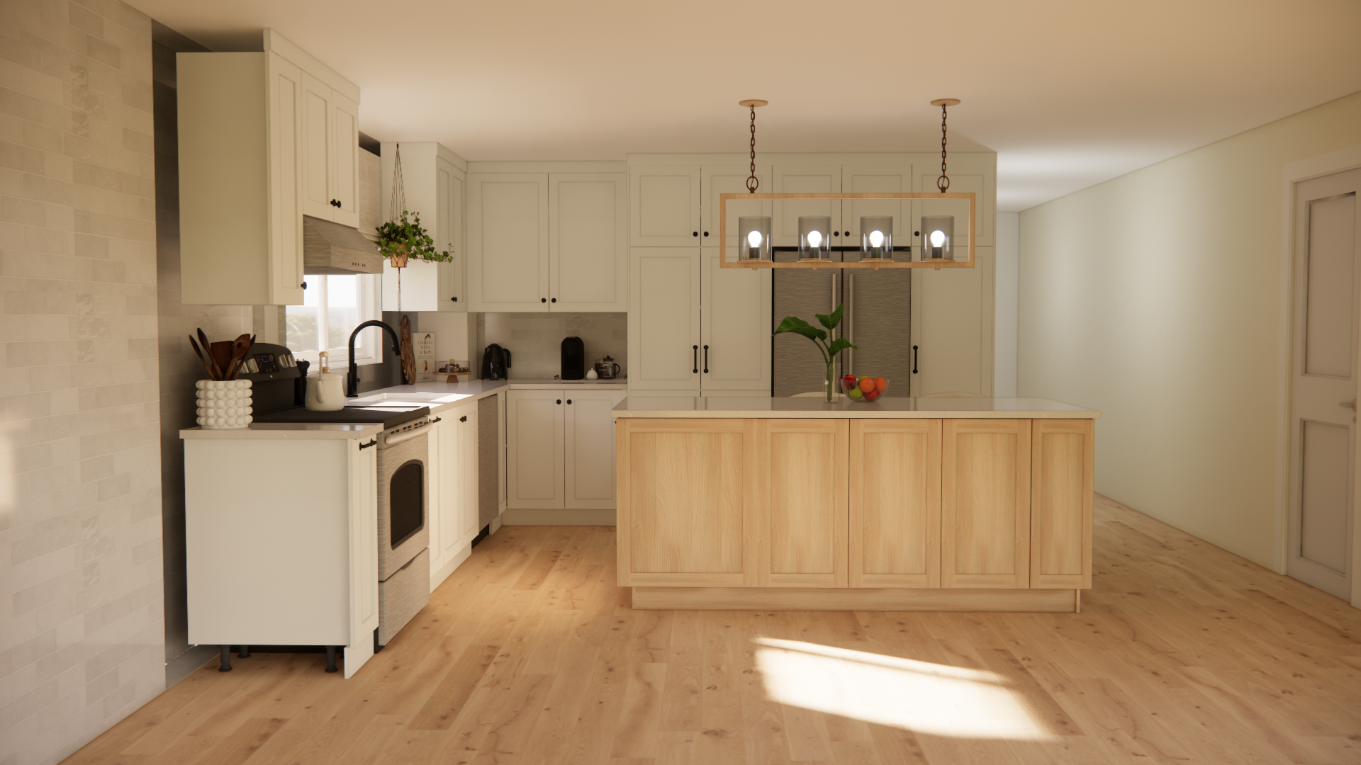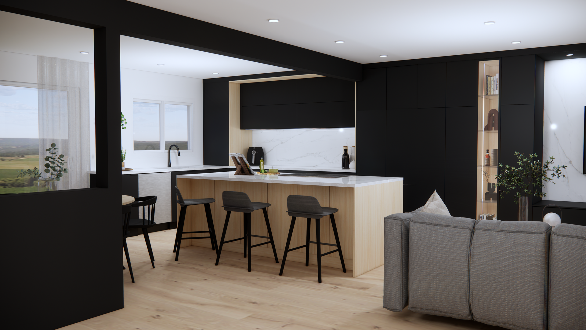 Une cuisine avec électroménagers en acier inoxydable et un grand îlot au milieu.